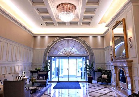 The carpeted hallway stretches on straight ahead. Antique-style lamps line the walls, casting a gentle light on the ceiling and floor. Time passes slowly in this elegant space inside a major train terminal used by 1 million people daily.