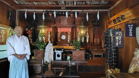 Jun Sato, the 38th-generation proprietor of Oosumi Sanso, stands at the shukubo’s worship hall.