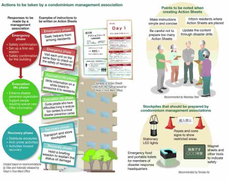 Compared to those in houses, apartment and condominium residents face greater inconvenience when disasters such as earthquakes trigger power outages. It is important for condominium management associations to be ready for disasters, for example, by preparing “Action Sheets” that contain simple and concise instructions on what actions to take in the event of a disaster.