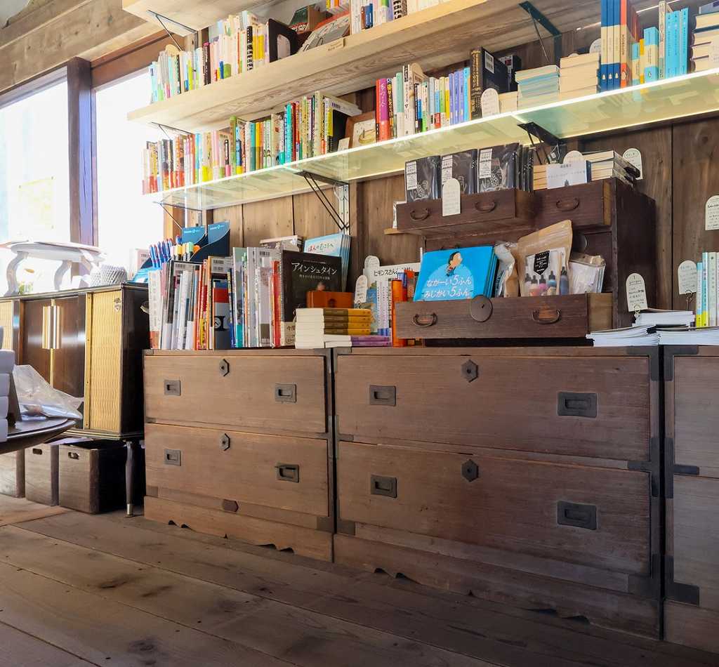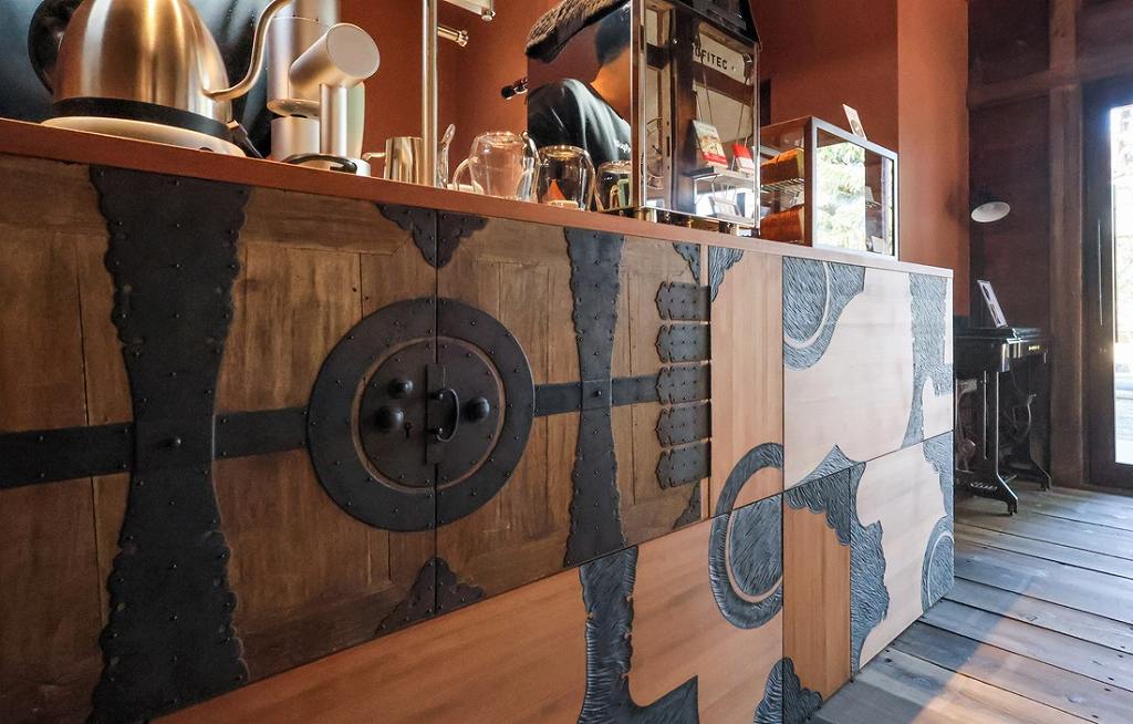 Paulownia tansu chests from the Edo period are used as counters at Apollon, a cafe.