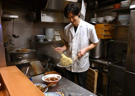 I set out for Tokyo’s Ginza to get a bowl of ramen and knew Kyoraku, approaching its 70th anniversary, would satisfy my purpose. The shop, founded in 1956, serves Japan’s most traditional and simple ramen: the chuka soba. It took a leap toward becoming an even more thriving establishment when third-generation owner Kazuhiko Nakano, 39, began serving noodles made from scratch. As I wandered through Ginza amid the year-end rush, I stopped by the shop, which always seems to have people lined up.