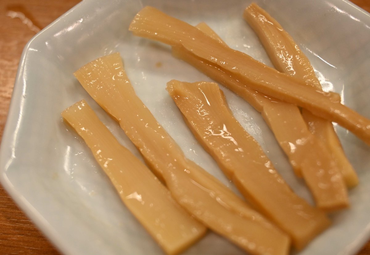 The wrappers of the homemade wontons are smooth and delicious, and the chashu has a gentle flavor. The menma, also made from scratch, can be eaten with the noodles, offering a subtle, savory soy sauce taste. The menma takes about five days to complete and is made by rehydrating dried bamboo shoots in water before simmering and then seasoning them. When the menma absorbs water, it flattens and expands, so Kazuhiko cuts it thinly to make it easier to eat with the noodles. He showed me a large bag of dried bamboo shoots, saying, “I think it’s rare to see menma made from dried bamboo shoots like this.”