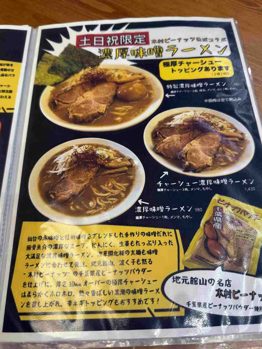 On weekends and holidays, the shop serves its “Rich Miso Ramen” topped with peanut powder from Kimura Peanuts, a well-known peanut shop in Tateyama. The peanuts apparently enhance the richness and aroma.