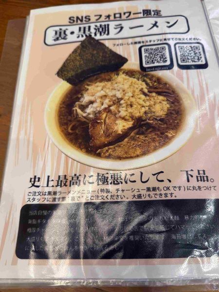 A menu item exclusive to those who follow the shop on social media. It features thick noodles and contains extra pork back fat and plenty of garlic to achieve an even richer flavor.
