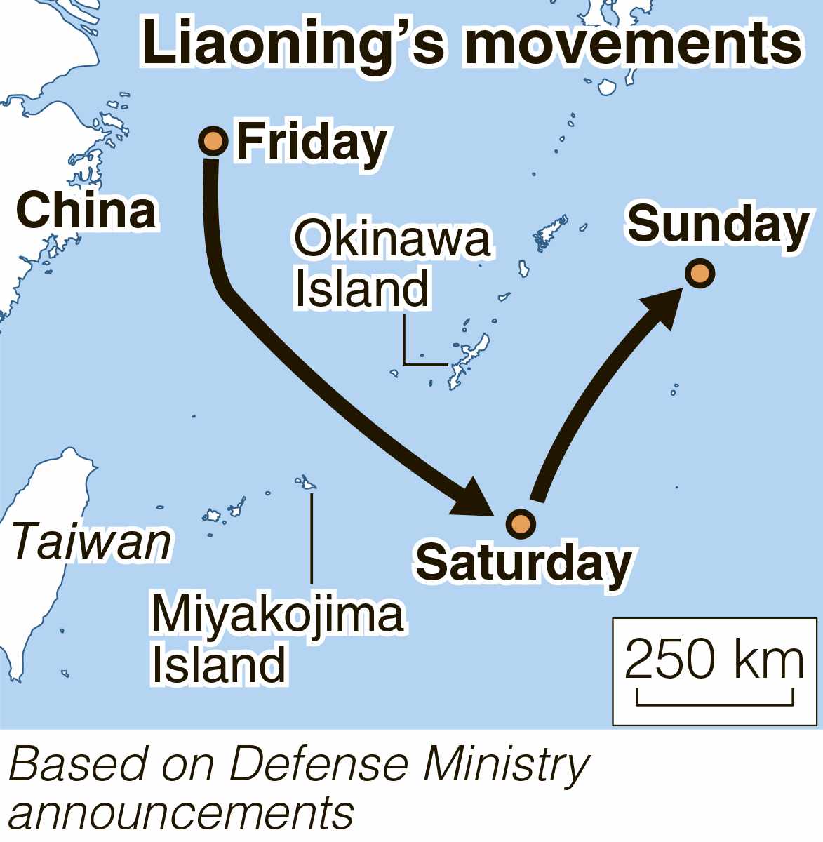 The Defense Ministry continues to monitor and track the movement of the Liaoning aircraft carrier. From Saturday through Sunday, it was confirmed to have sailed northeast from waters west of Okinawa’s Okidaitojima Island and to be navigating waters about 190 kilometers east of Kikai Island in Kagoshima Prefecture.