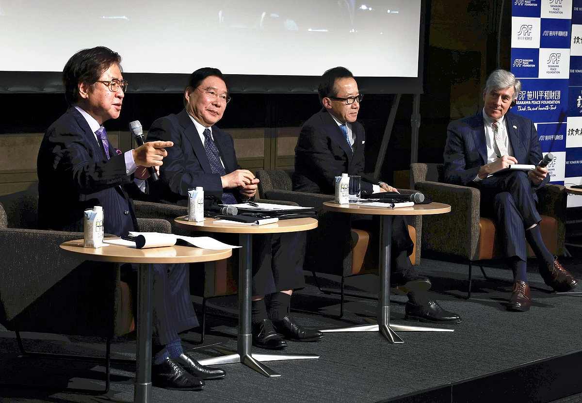 Forum panelists are seen in Minato Ward, Tokyo, on Wednesday. From left: Nobukatsu Kanehara, a former assistant chief cabinet secretary; Satoru Tezuka, chair of the government’s Personal Information Protection Commission; former National Security Secretariat Secretary General Shigeru Kitamura; and former U.S. National Cyber Director Chris Inglis.