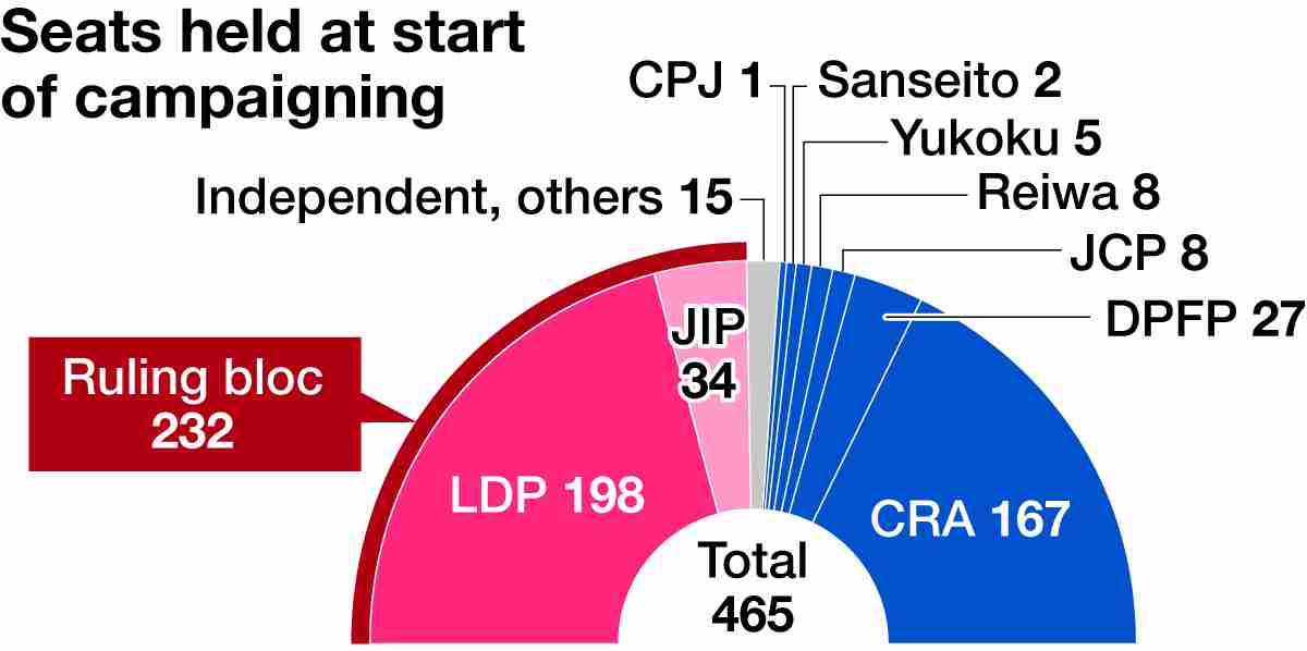 The candidates will vie for 465 lower house seats (289 single-seat constituencies and 176 proportional representation seats). The LDP and JIP aim to secure a majority, while opposition parties including the Centrist Reform Alliance and the Democratic Party for the People will compete against them.