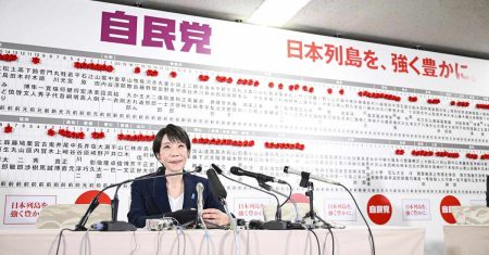 Takaichi appeared at the LDP’s headquarters in Chiyoda Ward, Tokyo, at around 9:40 p.m. on Sunday. She placed red roses next to the names of LDP candidates who had secured a victory.