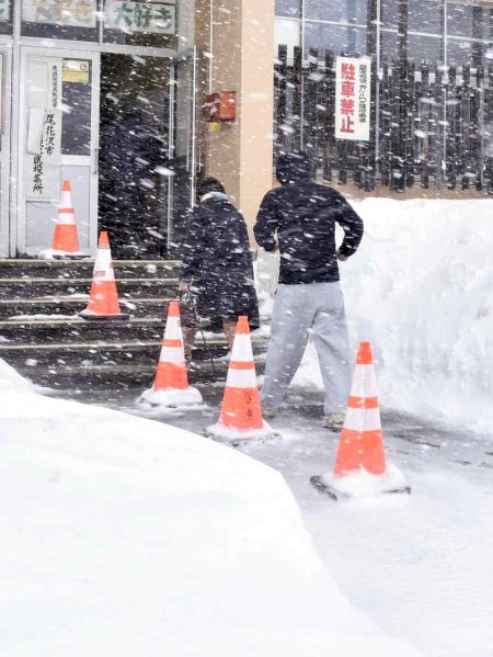 People head to a polling station during a blizzard in Obanazawa, Yamagata Prefecture, on Sunday.