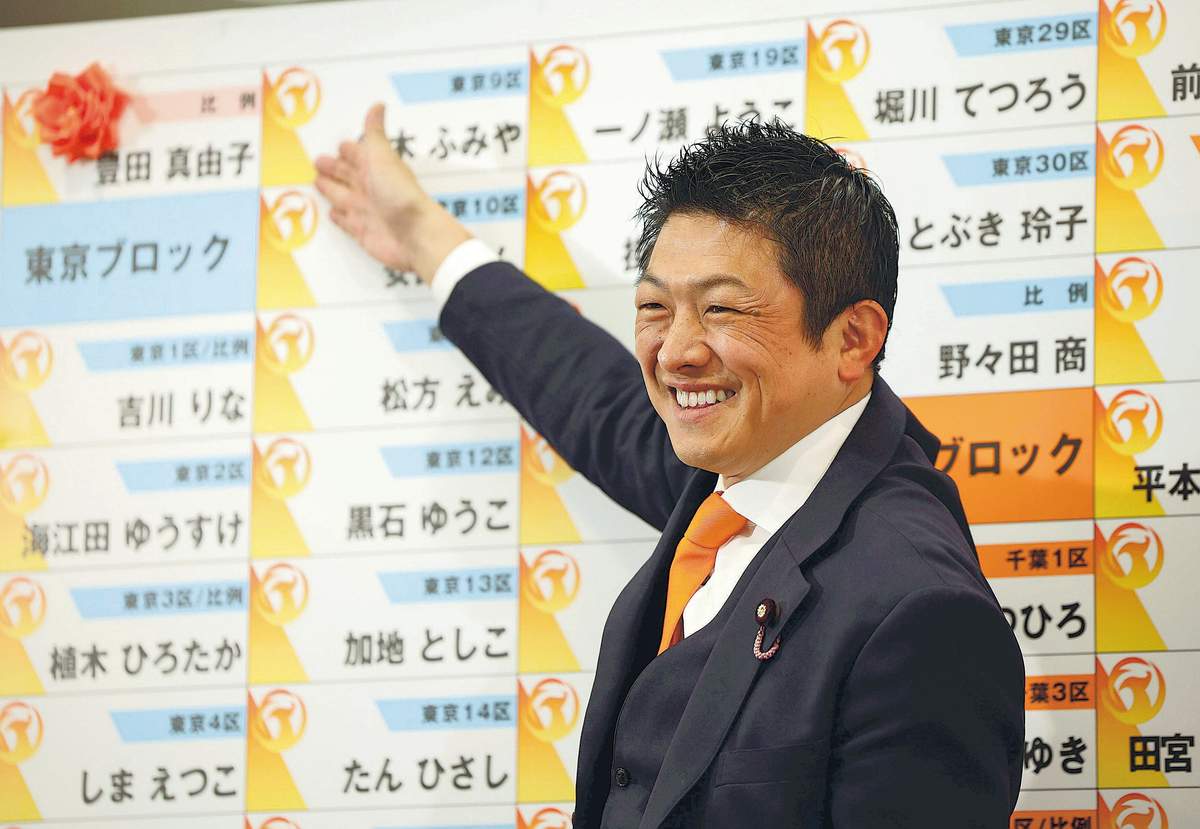 Sanseito leader Sohei Kamiya smiles in Shinjuku Ward, Tokyo, on Sunday evening as he points at the names of winning candidates in the House of Representatives election.