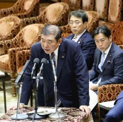 Japanese Prime Minister Shigeru Ishiba, right, and Laotian Prime Minister Sonexay Siphandone shake hands at the Prime Minister’s Office in Tokyo on Tuesday.