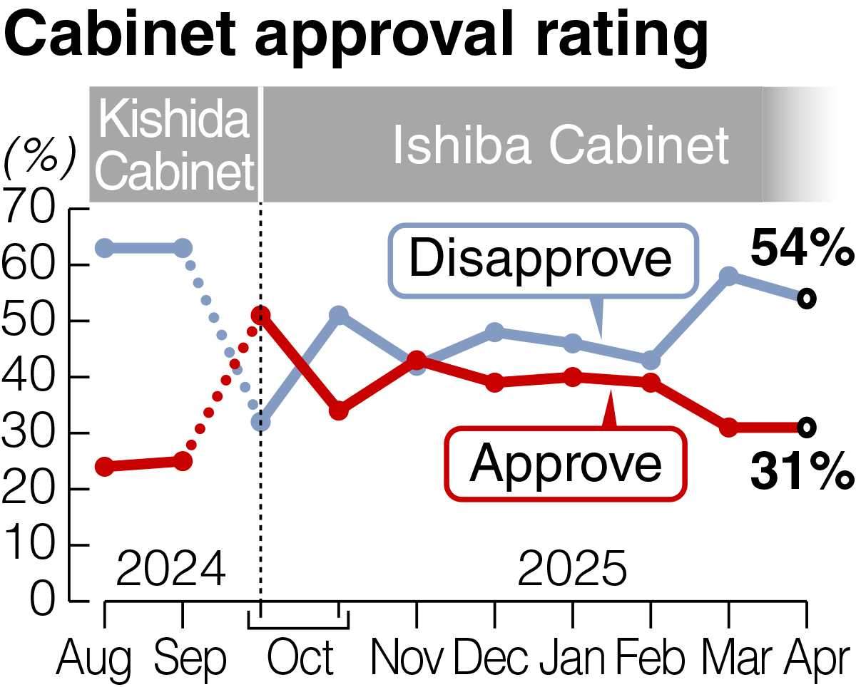 Approval remained at its lowest point since the Ishiba Cabinet was inaugurated. The disapproval rating stood at 54%, down four percentage points from 58% in the previous survey.