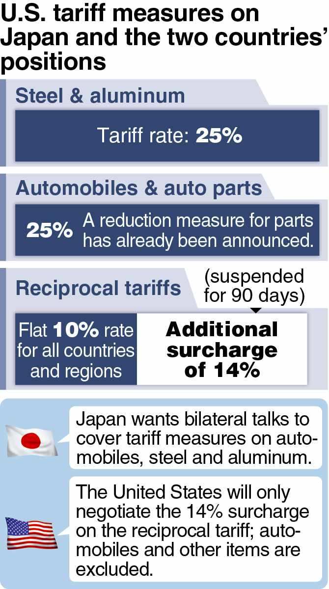 Washington has excluded automobiles and other key items from the scope of the talks. In response, Tokyo has insisted that it will make no concessions as it presses for a complete overhaul of each of the duties imposed Saturday, including those on auto parts.