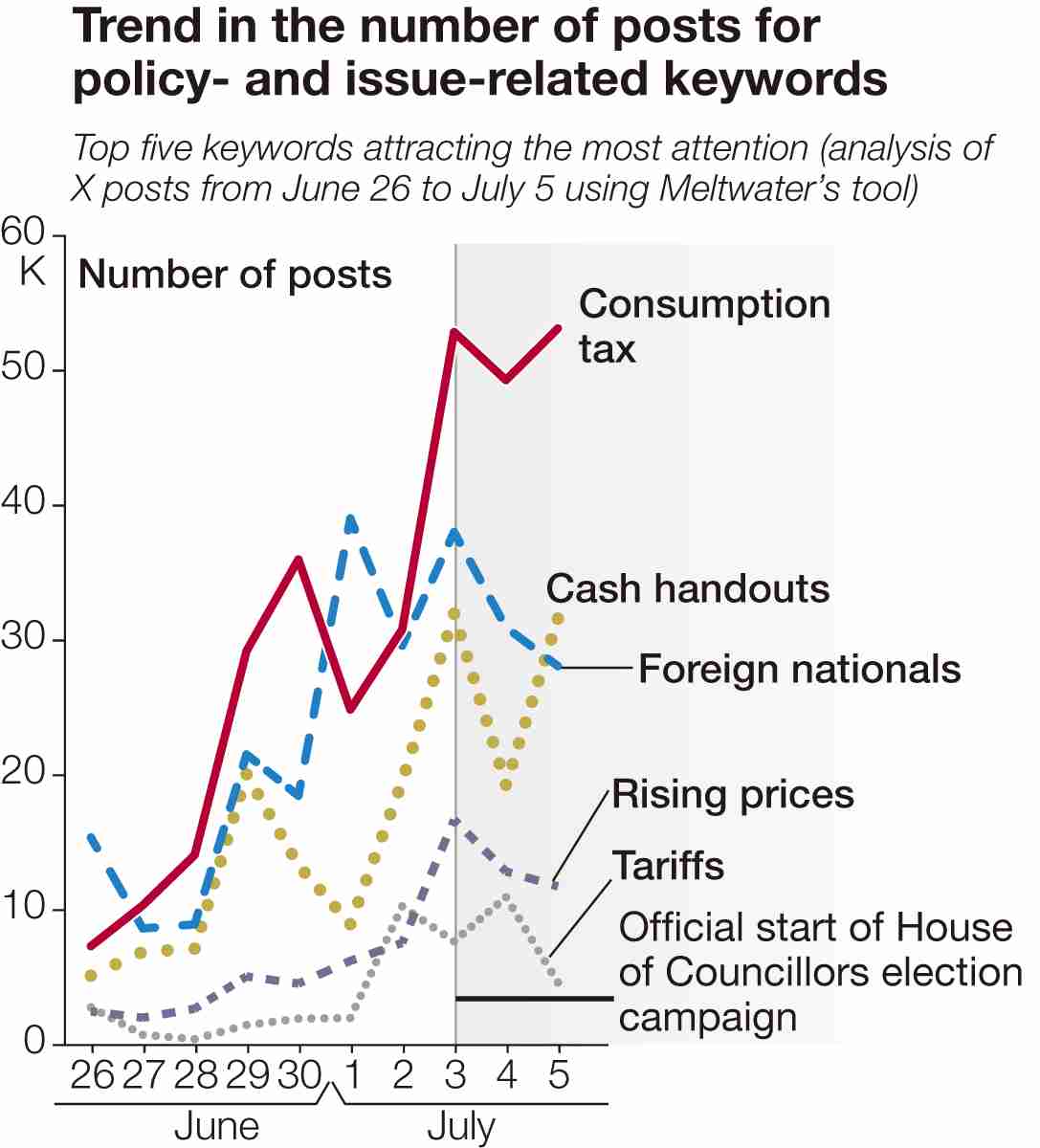 Using Meltwater’s social-media analytics tool, the newspaper examined the posts, including reposts, from June 26 — one week before the official campaign period — through Saturday. It tracked the volume of posts containing the term “House of Councillors election” in various Japanese forms plus each of the ten key words often cited in party manifestos or debates: consumption tax, foreign nationals, cash handouts, rising prices, tariffs, child-rearing, rice, social-insurance premiums, national security, and hidden funds.