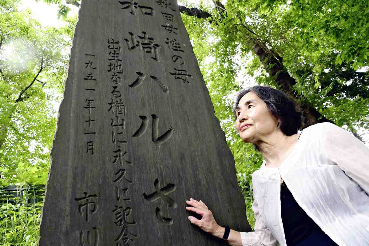 Midori Takahashi stands beside a monument commemorating her great-grandmother, Haru Wazaki, in Akita City on July 1.