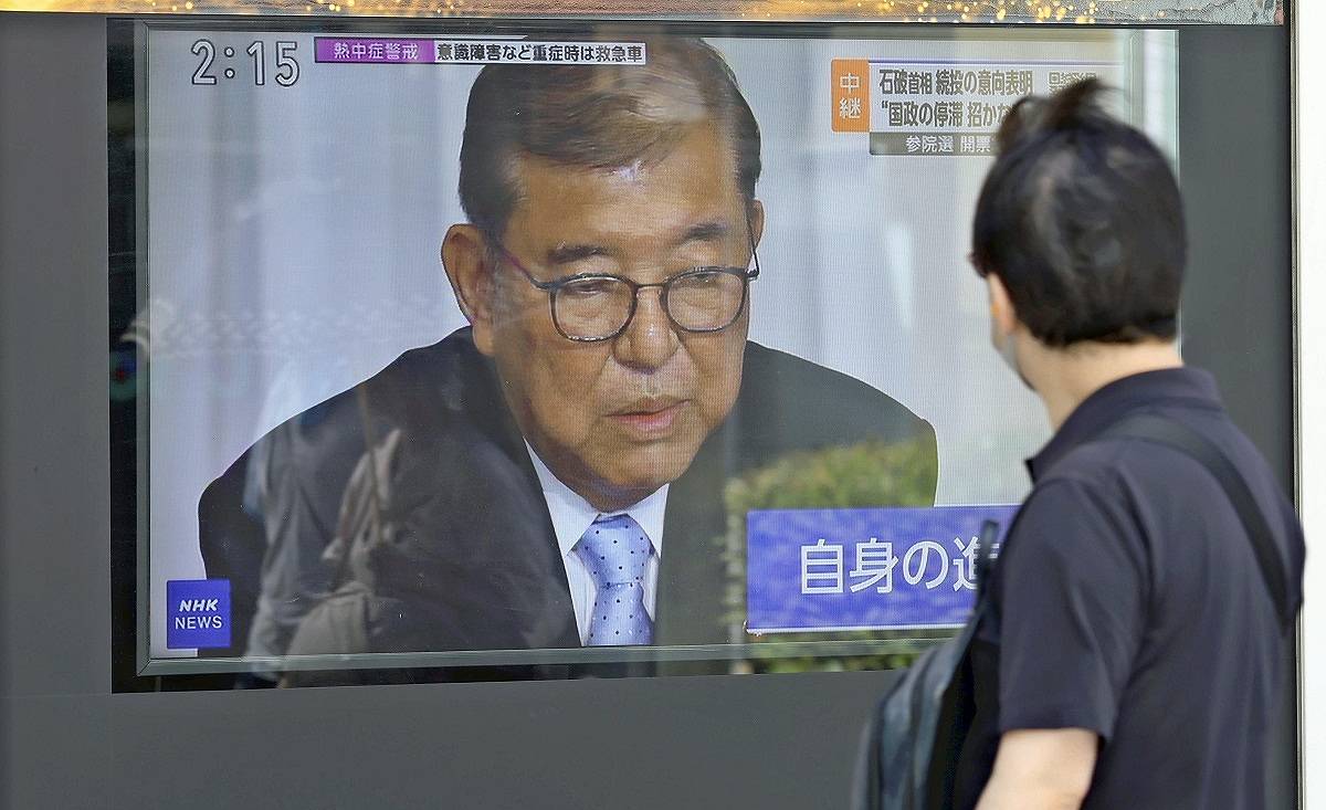 A TV screen on the street in Tokyo shows Prime Minister Shigeru Ishiba speaking at a press conference on Monday afternoon.