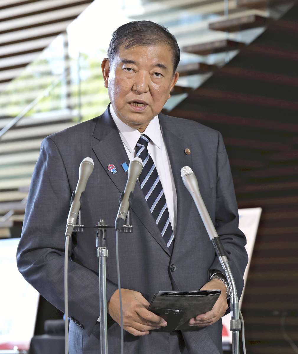 Prime Minister Shigeru Ishiba answers reporters’ questions after an LDP board meeting at the Prime Minister’s Office on Tuesday.