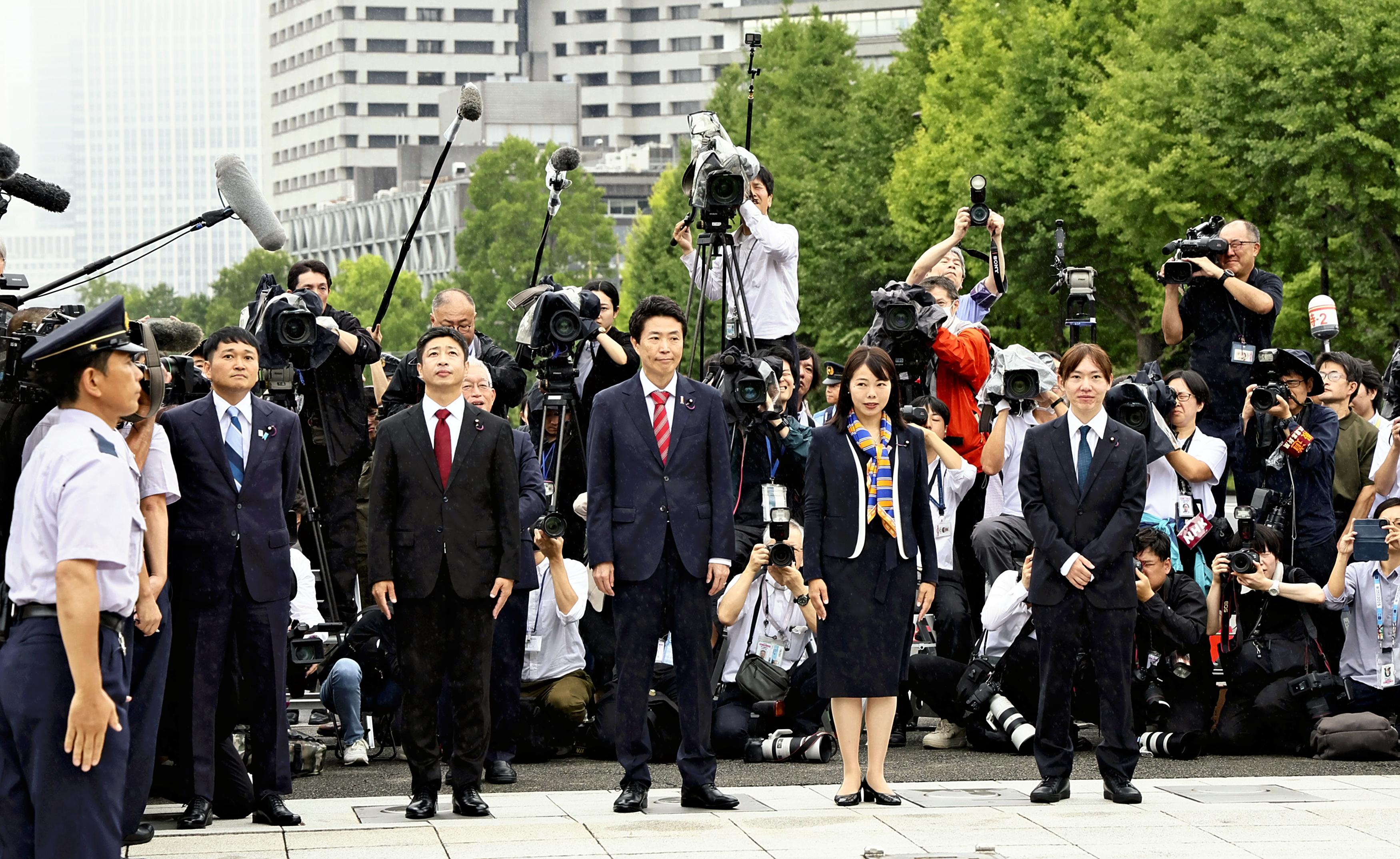 Lawmakers who were elected at the latest House of Councilors election stand in front of the Diet building Friday on their first day at work.