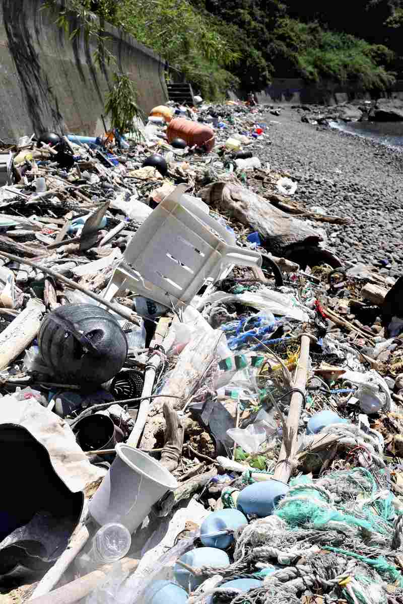 A plastic chair and other waste are seen washed ashore in Ehime Prefecture on June 17.