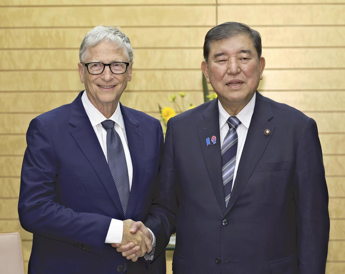 Bill Gates, left, and Prime Minister Shigeru Ishiba shake hands and pose for a photo at the Prime Minister’s Office in Chiyoda Ward, Tokyo, on Tuesday.