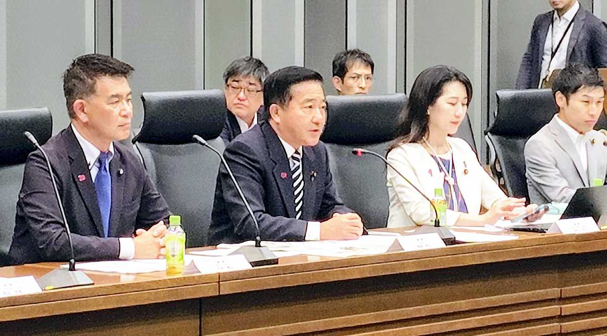 Akihisa Nagashima, secretary general of the Japan-South Korea Parliamentarians’ League, speaks at a meeting with the league’s South Korean counterpart on Thursday in Tokyo.