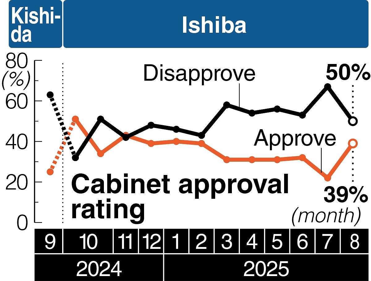The approval rating for Prime Minister Shigeru Ishiba’s Cabinet jumped 17 points to 39% in a recent Yomiuri Shimbun survey. That was up from 22% in the July survey, which was conducted immediately after the House of Councillors election in which the ruling Liberal Democratic Party and Komeito suffered a crushing defeat.