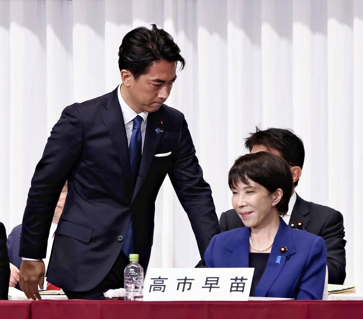 Agriculture, Forestry and Fisheries Minister Shinjiro Koizumi, left, and former economic security minister Sanae Takaichi are seen at the Liberal Democratic Party headquarters in Tokyo on Monday.