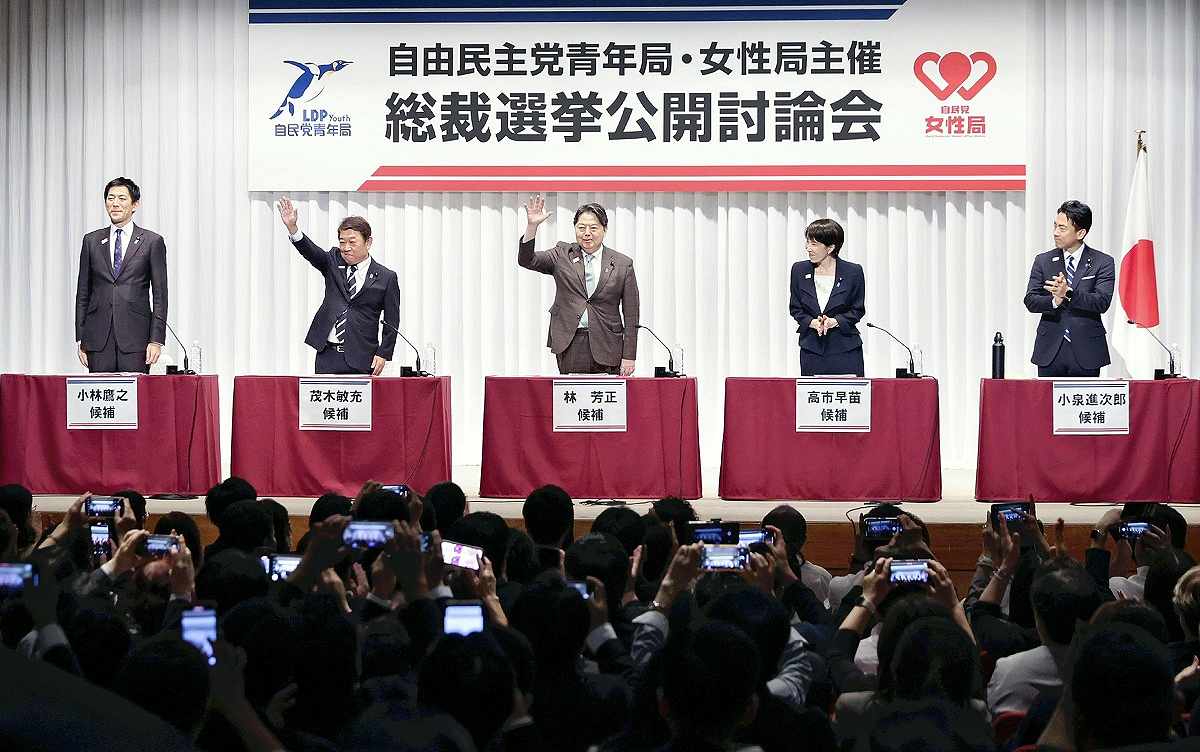 The debate was held Tuesday at the party’s headquarters in Tokyo, sponsored by the Youth Division and Women’s Affairs Division, where the five candidates answered questions from LDP regional assembly members.