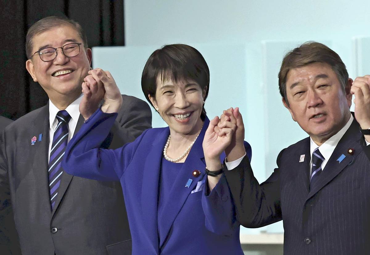 Newly elected Liberal Democratic Party President Sanae Takaichi, center, poses for a photo with Prime Minister Shigeru Ishiba, left, at the party’s headquarters in Tokyo on Saturday.