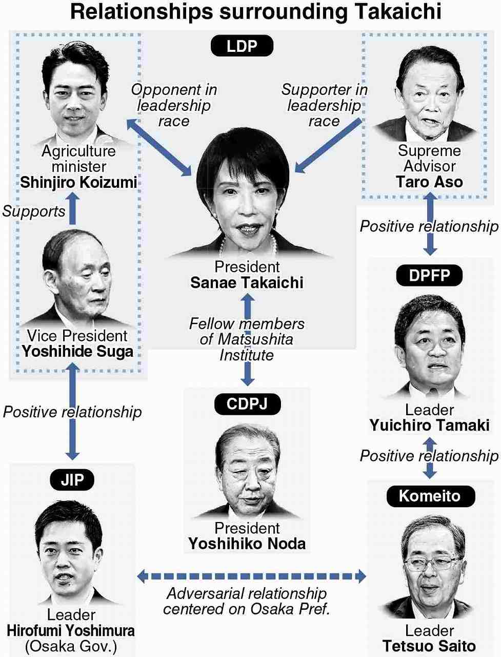 CDPJ President Yoshihiko Noda is senior to Takaichi at the Matsushita Institute of Government and Management, a public interest incorporated foundation that develops future leaders, and Noda interviewed Takaichi during her admission process.