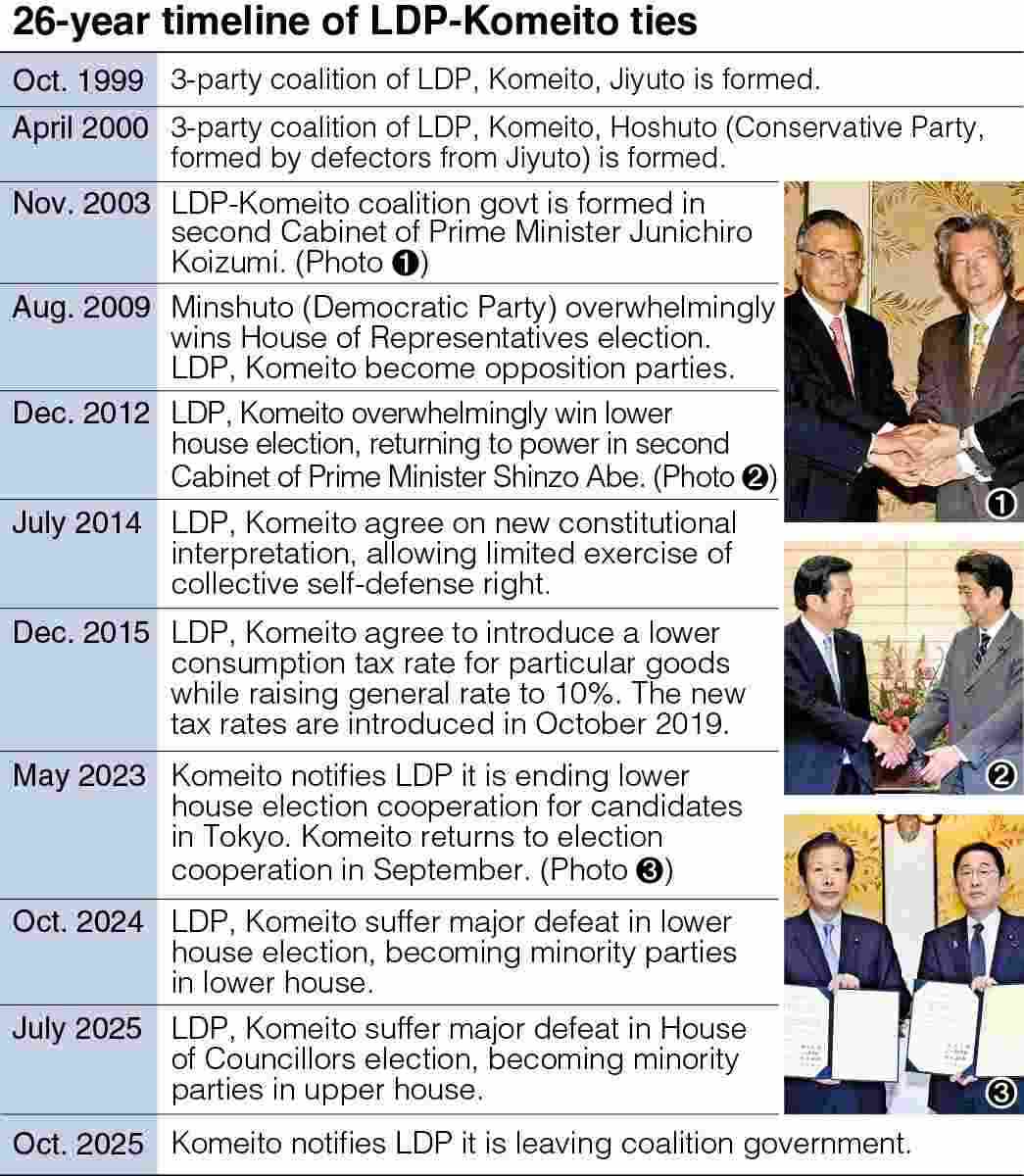 A sudden end was brought on Friday to the 26-year history of cooperation between the Liberal Democratic Party and Komeito. Though the two parties maintained their cooperative relationship even when the LDP fell into opposition, enduring tough times, Komeito’s dissatisfaction reached its peak over the LDP’s “politics and money” issues, driving Komeito to dissolve the coalition.