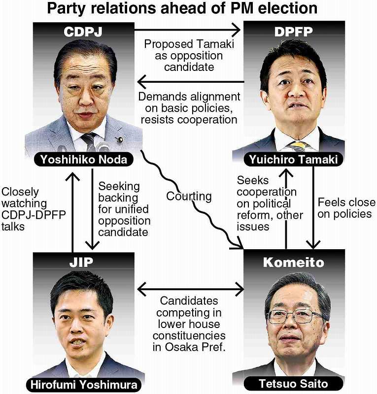 As the largest opposition party, members of the CDPJ are supposed to vote for their leader, Yoshihiko Noda, in the election to choose the next prime minister during the upcoming extraordinary Diet session. However, the CDPJ is aiming for a change of government by uniting the opposition forces. It has therefore proposed an unconventional strategy: voting for Tamaki.