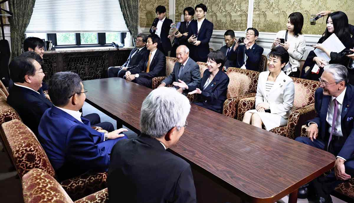 Liberal Democratic Party President Sanae Takaichi greets to Constitutional Democratic Party of Japan leader Yoshihiko Noda and others in the Diet Building in Tokyo on Oct. 8.