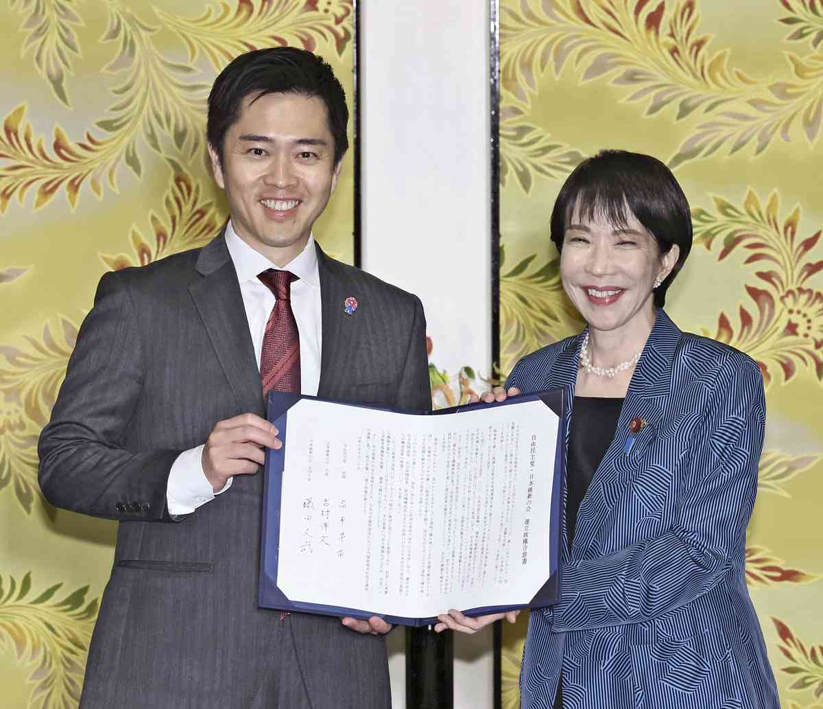 “This coalition government [with the JIP] is essential for advancing politics with strength,” Takaichi said with a smile at a joint press conference on Monday after signing a document on the coalition agreement.