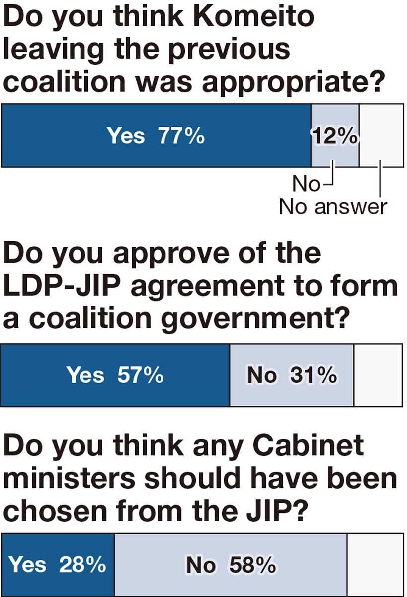 In the survey, conducted on Tuesday and Wednesday, 70% of LDP supporters approved of the agreement of the LDP and JIP to form a coalition government, while 22% disapproved. Out of all respondents, 57% approved and 31% disapproved.