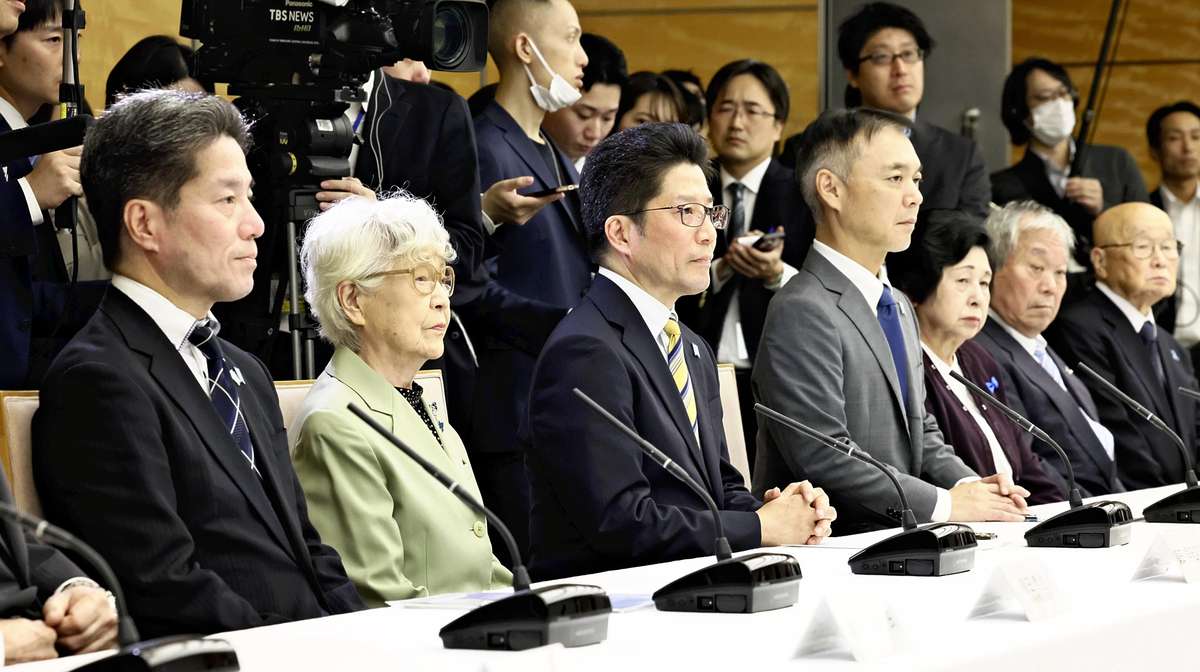 Takuya Yokota, center, head of the Association of Families of Victims Kidnapped by North Korea, and his mother, Sakie Yokota, second from left, meet with Prime Minister Sanae Takaichi at the Prime Minister’s Office on Thursday.