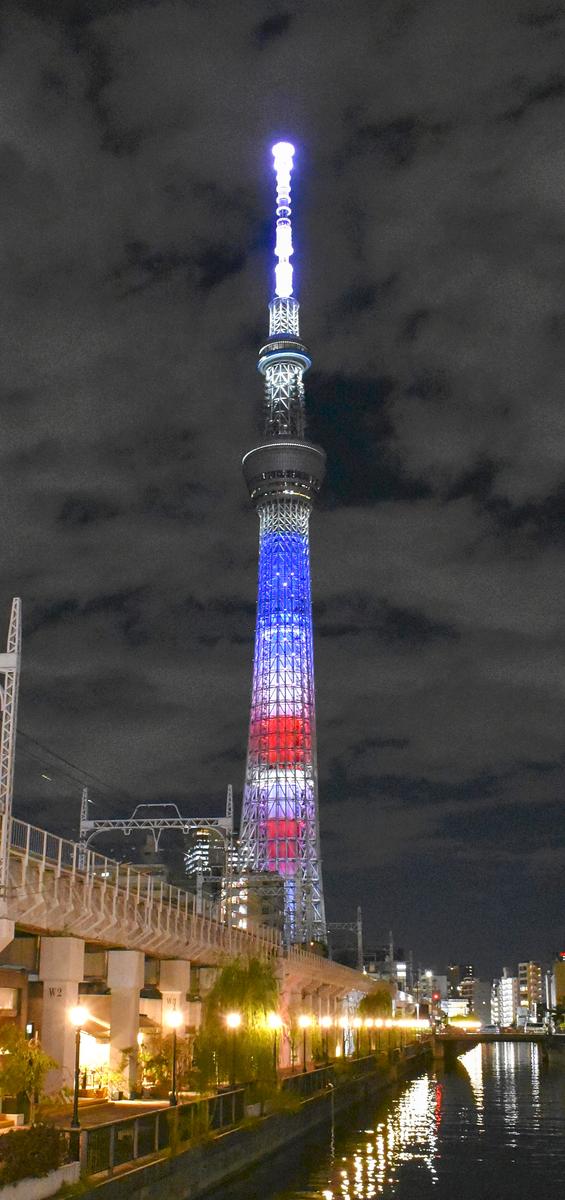 Tokyo Skytree is illuminated in red, white and blue on Monday to mark a visit by U.S. President Donald Trump to Japan.