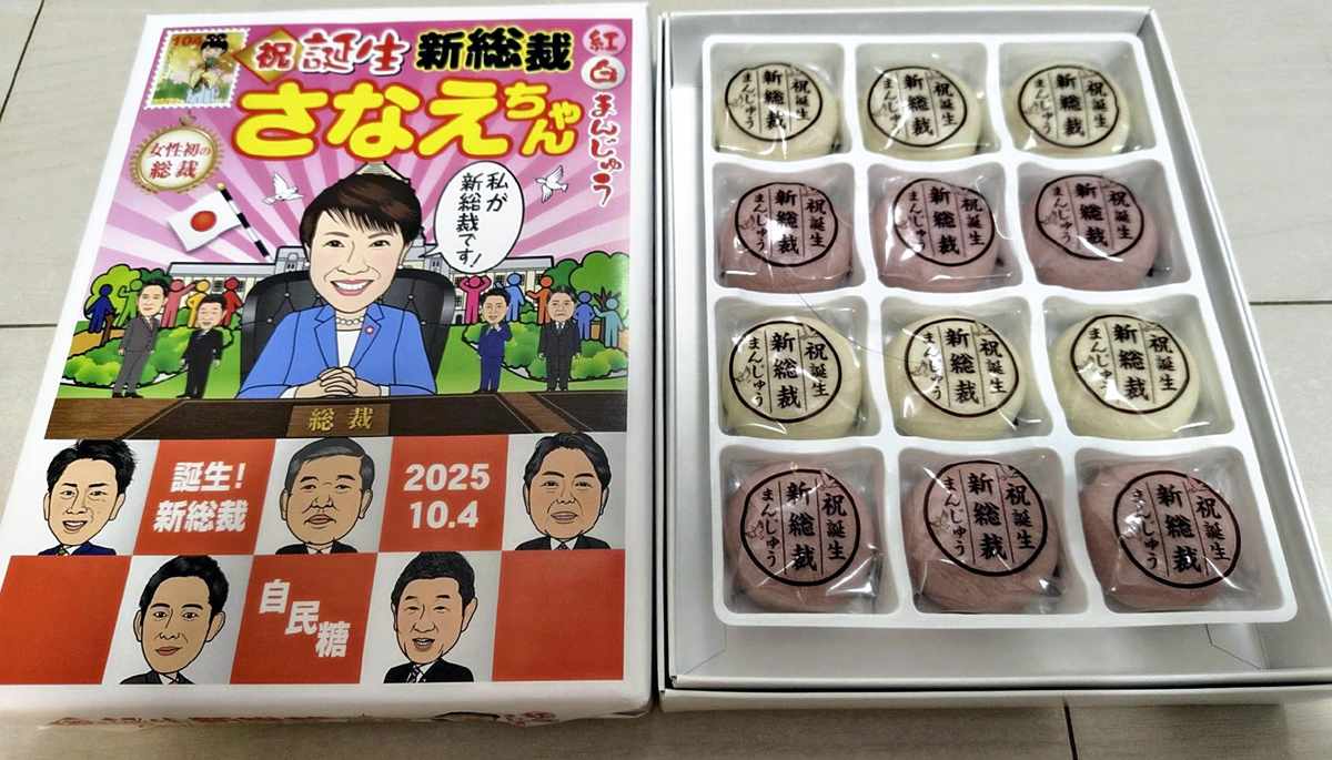 Packaging of red and white manju sweet buns featuring a drawing of Sanae Takaichi