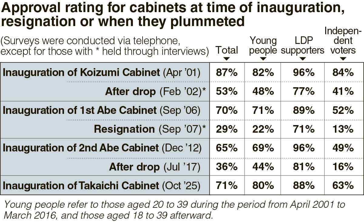 Among the administrations since 1978, the Koizumi Cabinet, which was in place from April 2001 to September 2006, recorded the highest initial approval rating of 87%, as well as 84% among independent voters.