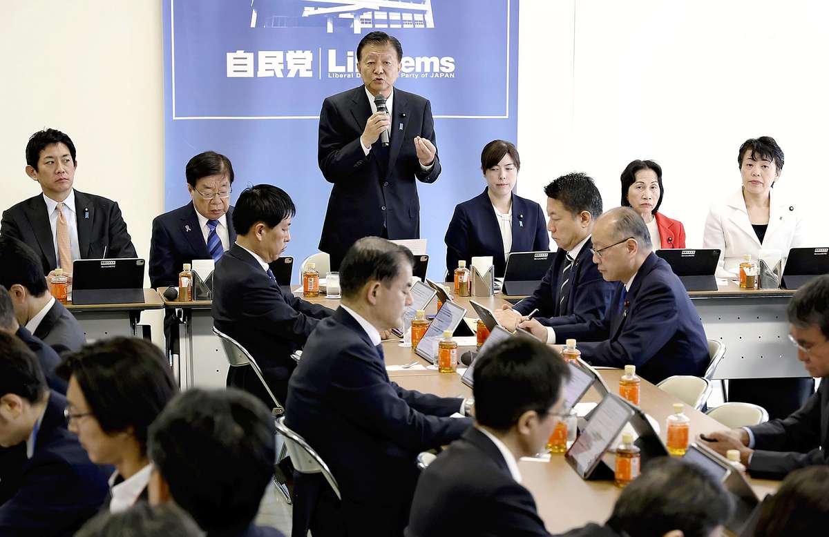 Yoshitaka Shindo, the head of the Liberal Democratic Party headquarters on measures regarding foreign nationals, speaks during a meeting on Tuesday.