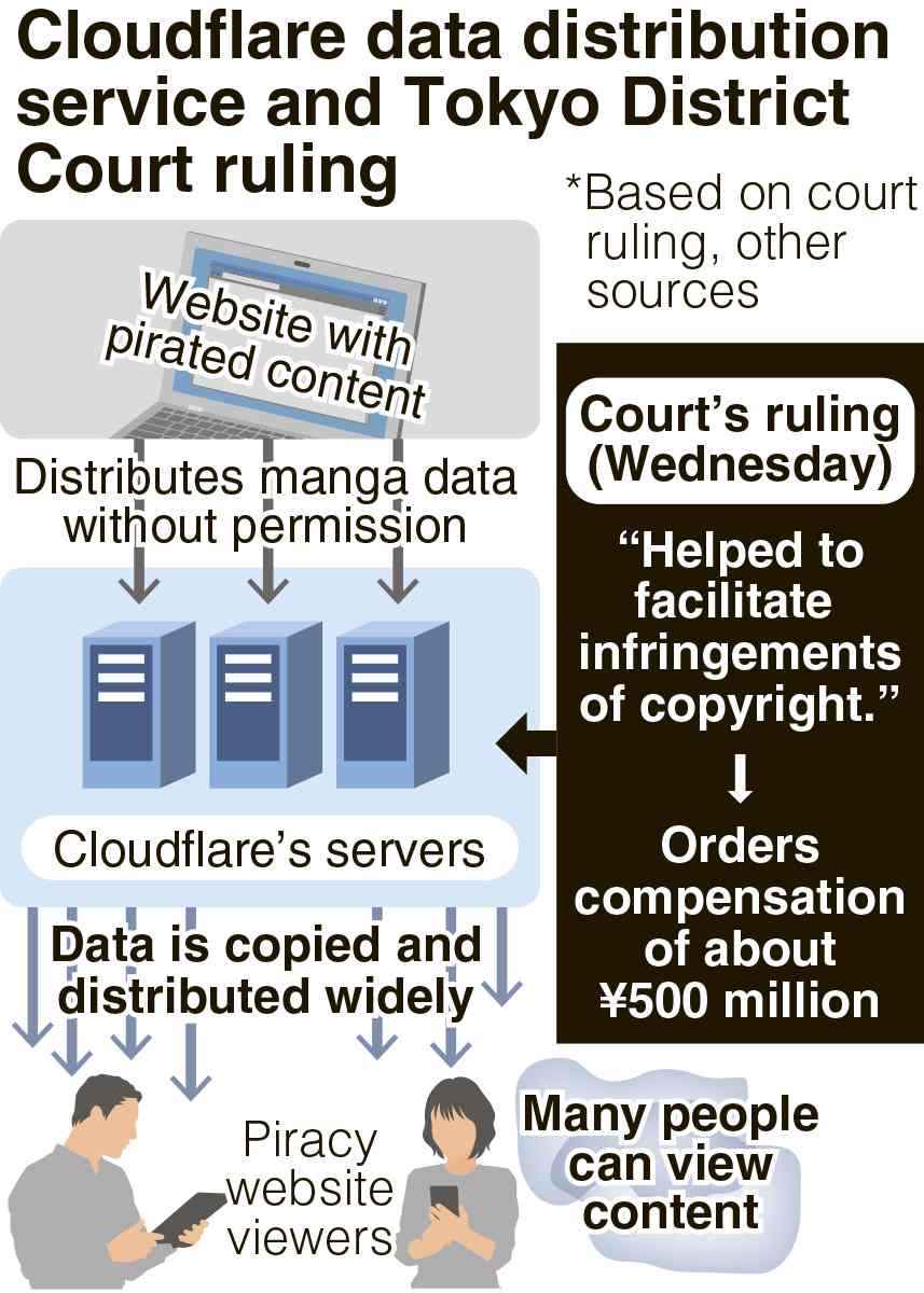The four publishers — Kadokawa Corp., Kodansha Ltd., Shueisha Inc. and Shogakukan Inc. — had been seeking damages totaling about ¥506 million from Cloudflare, Inc. In handing down the ruling and ordering compensation of ¥500,900,000, presiding Judge Aya Takahashi said Cloudflare’s provision of the service “constituted an act that helped to facilitate infringements of copyright.”