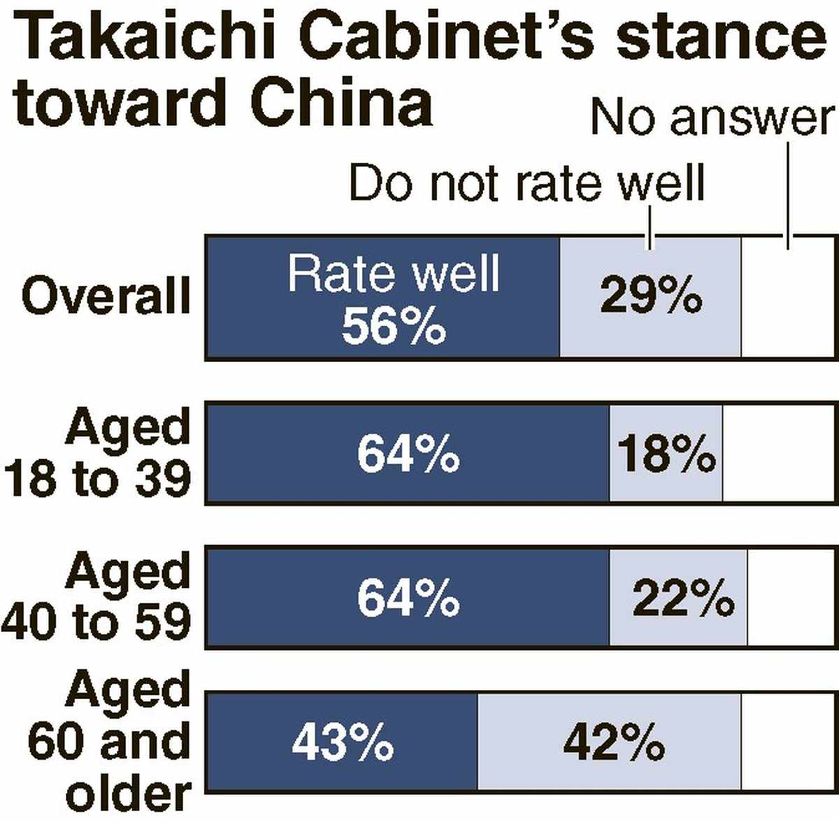 Approval of the Takaichi Cabinet’s stance toward China was high with 56% of respondents saying they “rate the stance well.” By age group, 64% of those aged 18-39 and 64% of the 40-59 group rated the stance well. However, only 43% among those aged 60 and older rated it well, showing a generational divide.
