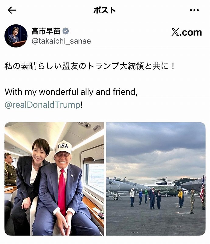 Japan’s Takaichi Makes Successful Diplomatic Debut, Manages to Establish Warm Rapport with Donald TrumpWhen it comes to diplomacy, Takaichi actively posts pictures of her interacting with foreign leaders. On Oct. 28, she posted a photo of her with U.S. President Donald Trump taken in the presidential helicopter during his visit to Japan. On Oct. 31, she posted a candid photo of her smiling with Chinese President Xi Jinping in the waiting room of the Asia-Pacific Economic Cooperation (APEC) summit in South Korea.