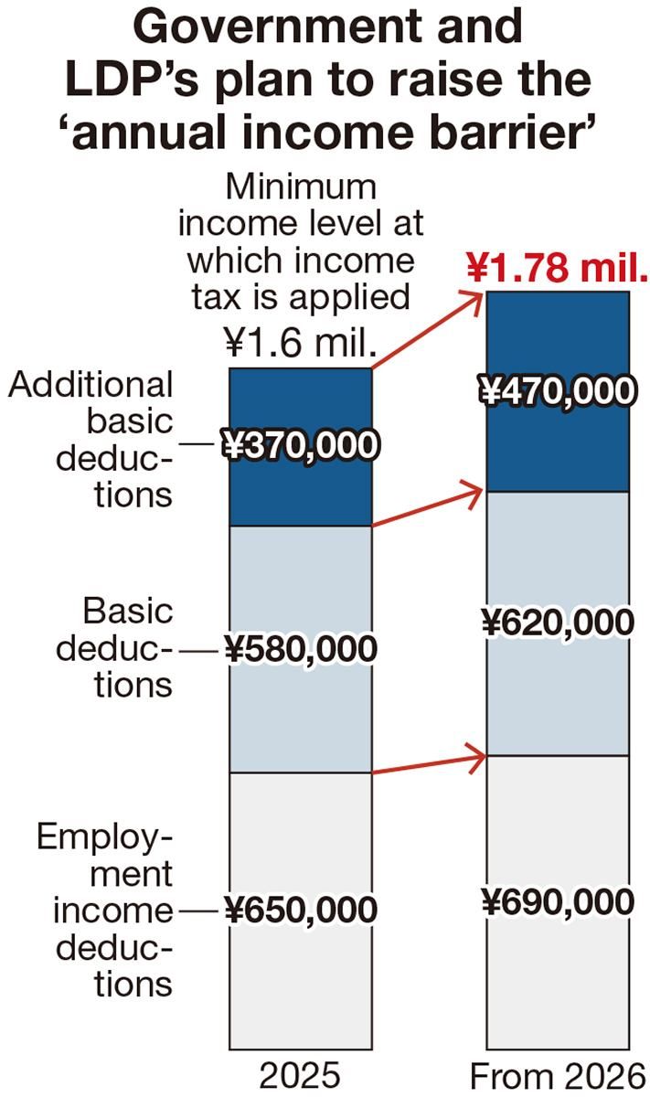 The government and the ruling Liberal Democratic Party intend to raise the “annual income barrier” — the income threshold for the imposition of income tax — from the current level of ¥1.6 million to ¥1.78 million.