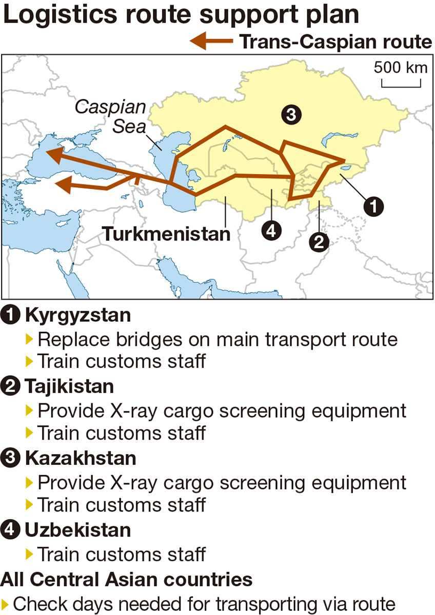Japan will survey the time it takes on the route in each Central Asian country, while working with international organizations to train customs officials.