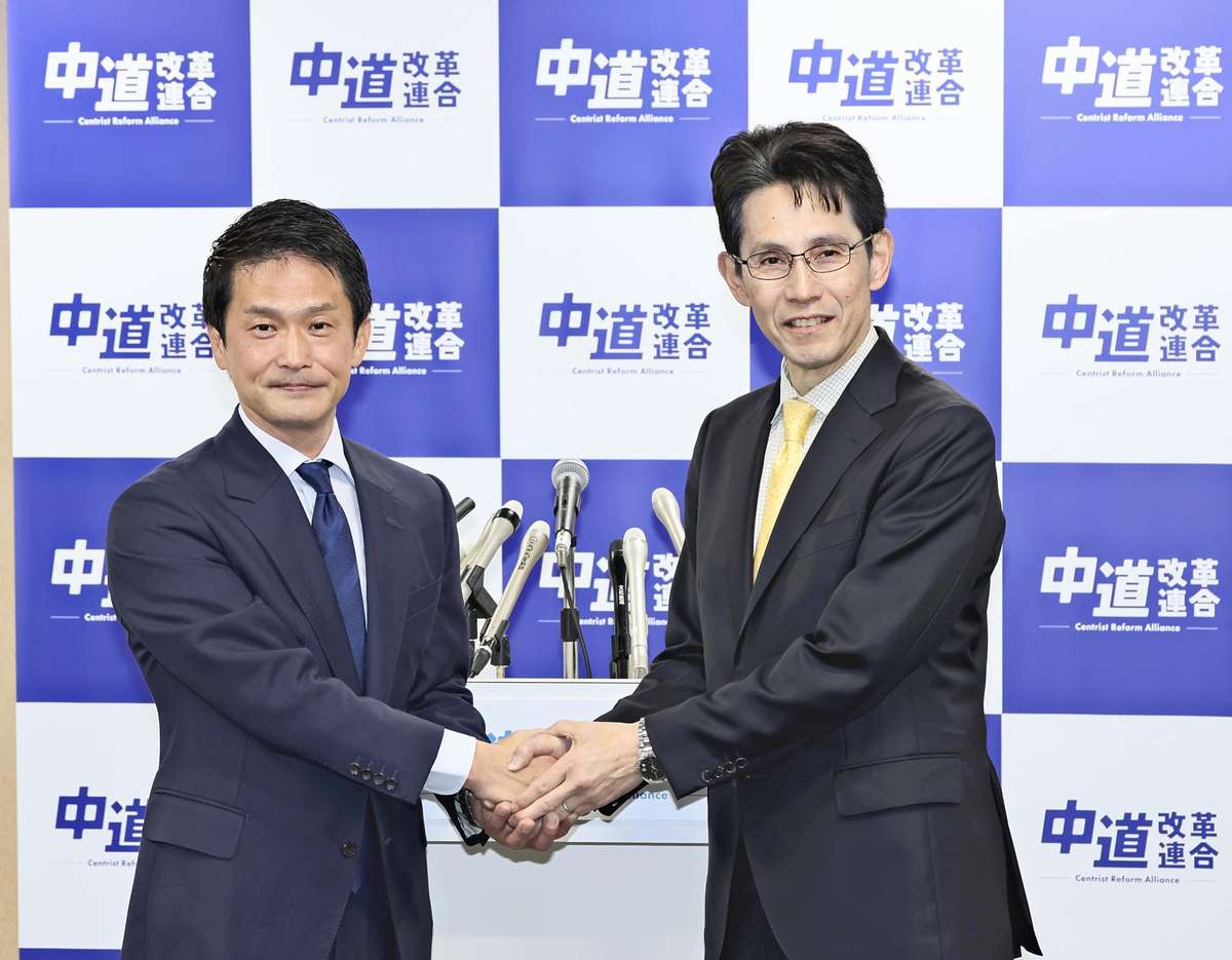 Takeshi Shina, right, and Junya Ogawa, who are running for leadership of the Centrist Reform Alliance, shake hands at a joint press conference in Tokyo on Thursday.