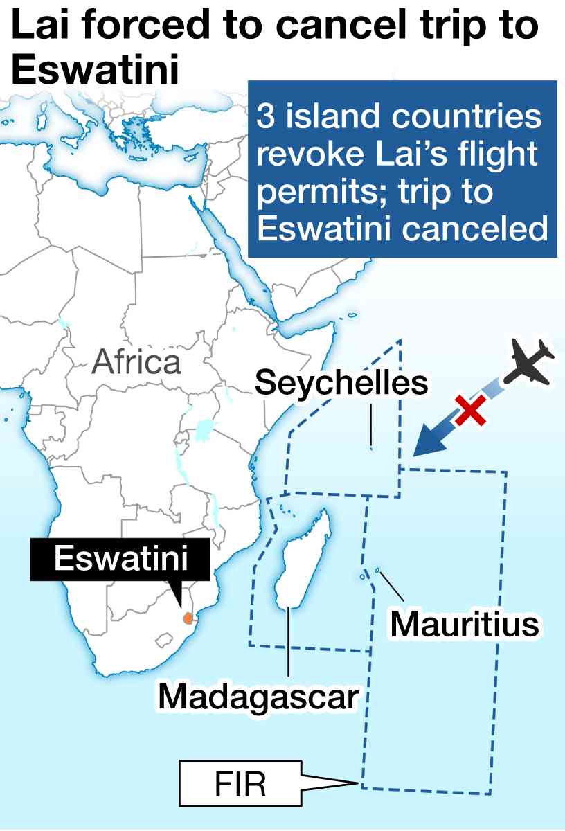 Lai was scheduled to visit Eswatini on Wednesday via a presidential plane, but his flight permits were revoked by Seychelles, Mauritius and Madagascar, which are located along the planned route.