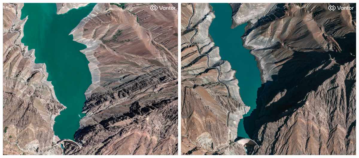 A combination picture shows satellite views of variations in the water level of the Amir Kabir Dam, near Karaj, Iran, on May 1, left, and Nov. 8.