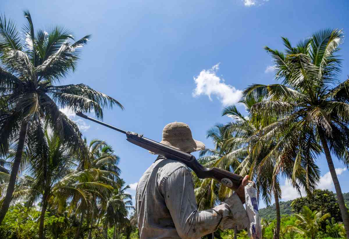 With an air gun across his shoulder and lead pellets in a plastic bag, Gnanasena spends hours patrolling the neat rows of coconut, mango and banana plants he has carefully grown.