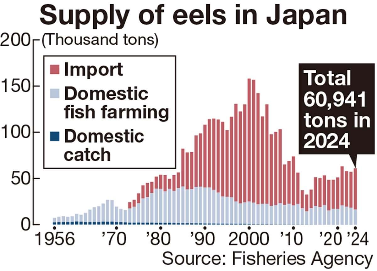 While Japan consumes the largest number of eels in the world, it relies on imports for most of its supply. According to the Fisheries Agency, approximately 70% of the 61,000 tons of eels on the market in Japan were imported, with 90% of that coming from China.